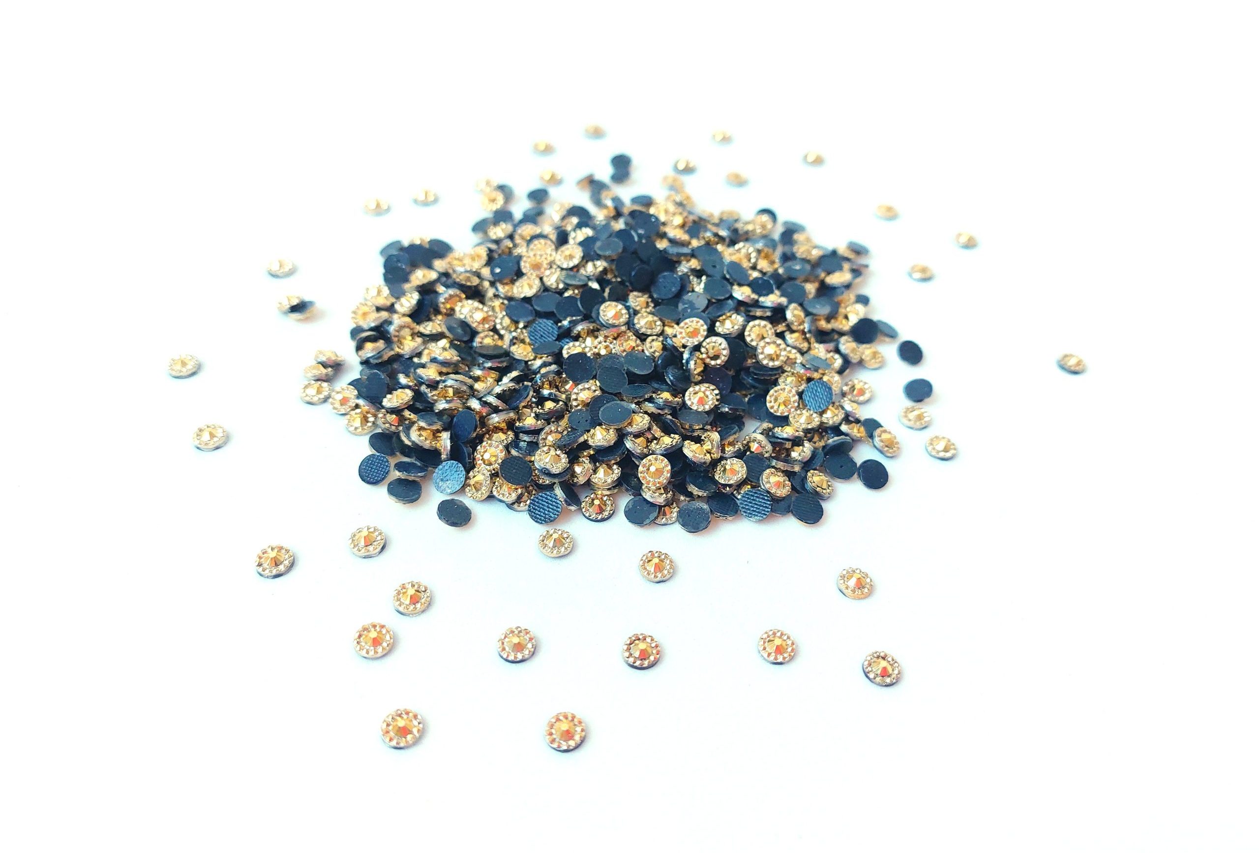 Brillo termoadhesivo redondo facetado, diámetro 5mm, dorado. Presentación en 10 gramos. Cantidad aprox.: 350 unidades.