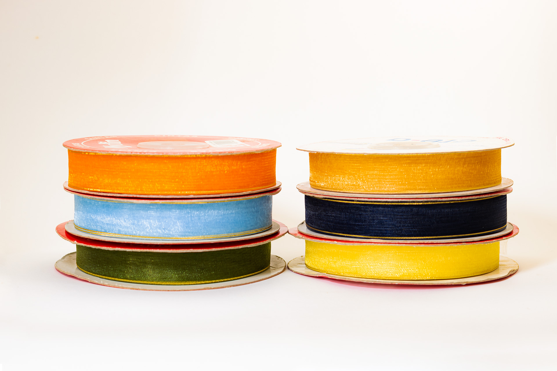 Cinta de organza con borde dorado, ancho 5/8” (1.6cm), rollo de 50yds (45m).