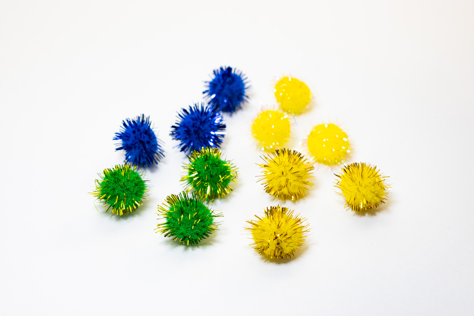 Pompom de 15mm de diámetro, con brillo, pack de 50 unidades por color.